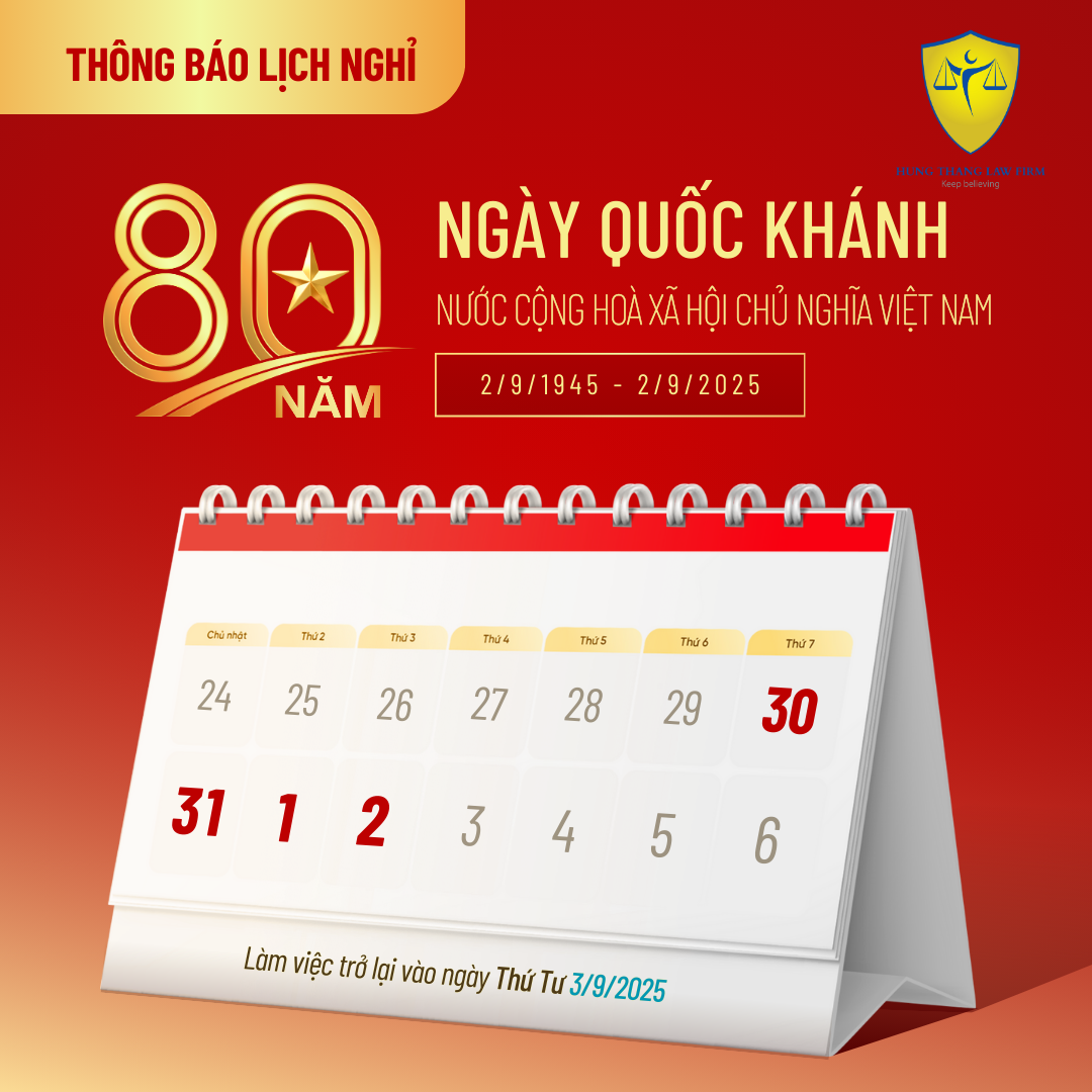 Công ty Luật Hùng Thắng trân trọng thông báo đến Quý khách hàng và Quý đối tác Lịch nghỉ lễ Quốc Khánh 02/09/2025 như sau: