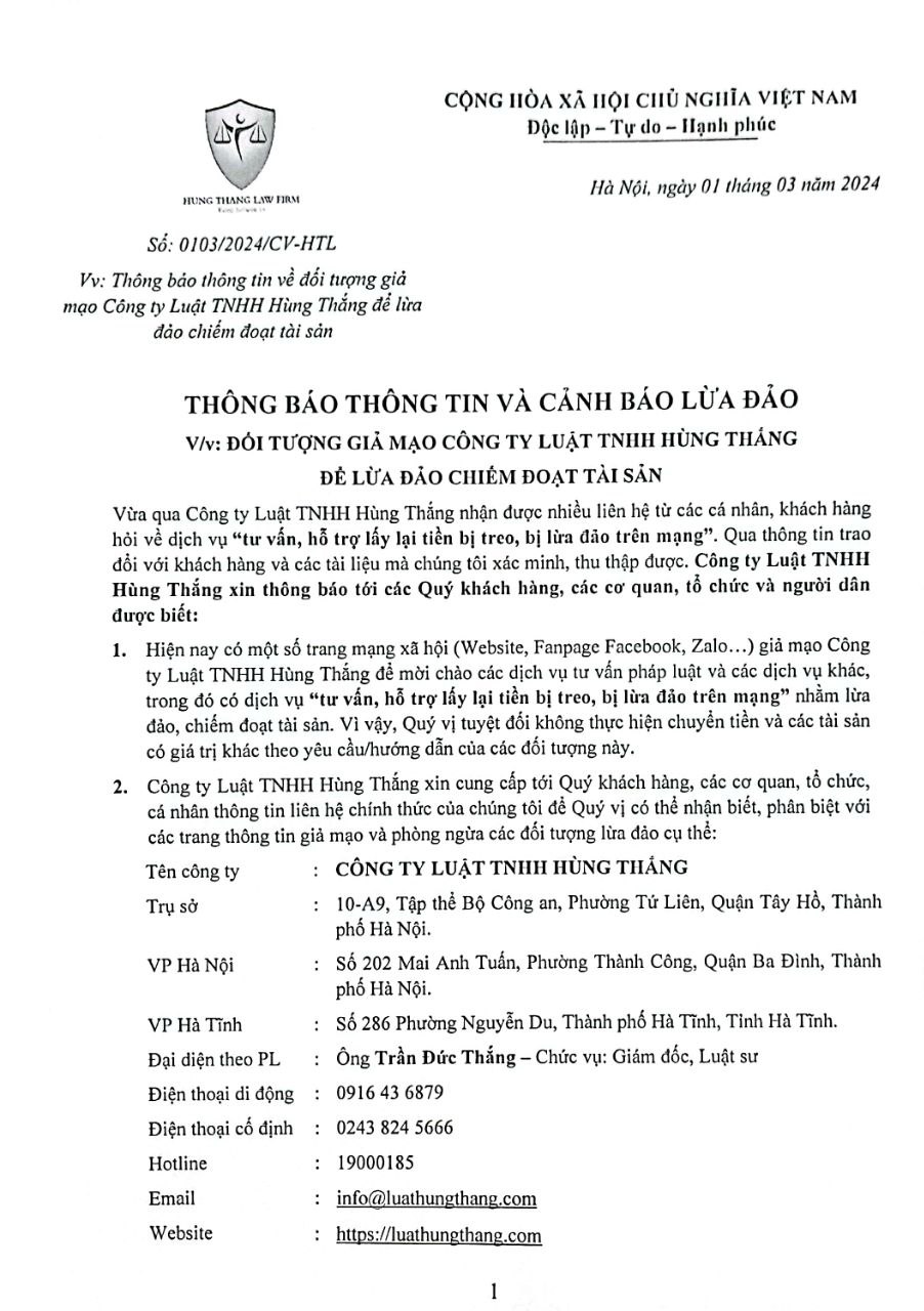 Thông báo thông tin và cảnh báo lừa đảo của Công ty Luật TNHH Hùng Thắng:
