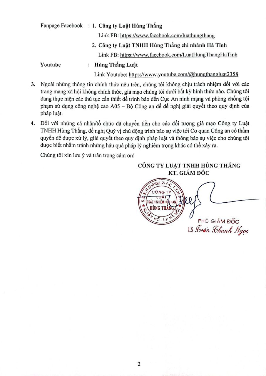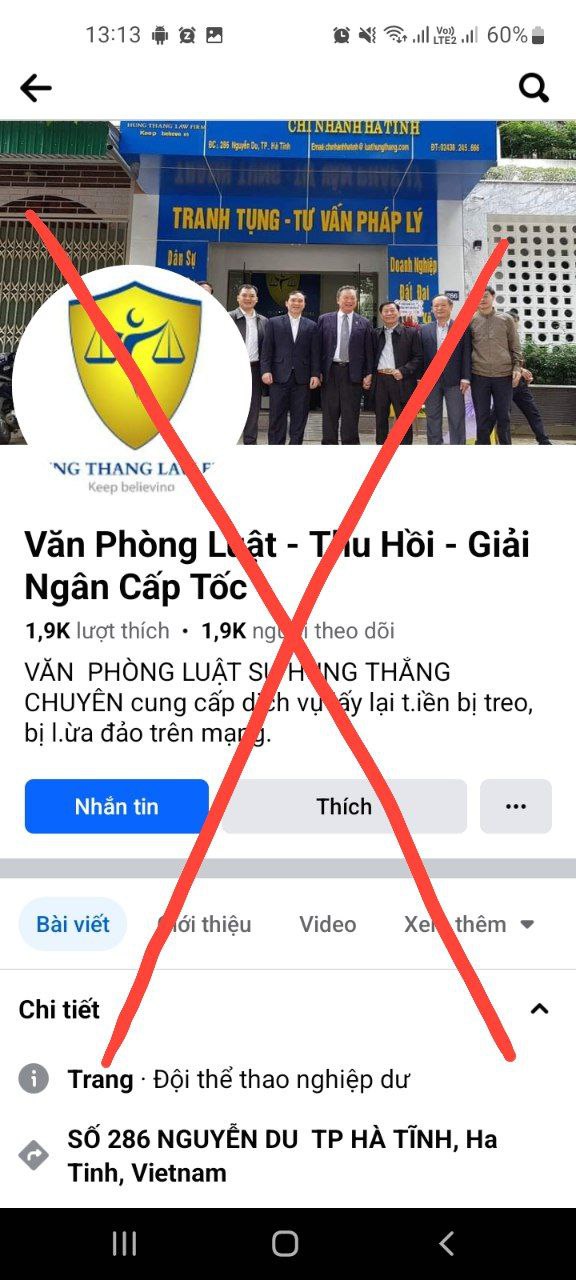 Sau khi tiếp nhận các thông tin của khách hàng nêu trên, chúng tôi đã đề nghị và được khách hàng cung cấp các nội dung, tài liệu, chứng cứ mà khách hàng đã làm việc với đối tượng tự xưng là “Văn phòng Luật Hùng Thắng”. Đồng thời, ngay lập tức chúng tôi tìm hiểu và được biết hiện nay có rất nhiều cá nhân/tổ chức mạo danh chúng tôi để thực hiện các hành vi giả mạo gây ảnh hưởng nghiêm trọng đến danh dự, uy tín của Công ty chúng tôi và có dấu hiệu của tội lừa đảo chiếm đoạt tài sản qua mạng một trong số đó là trang Fanpage Facebook “Văn Phòng Luật - Thu Hồi - Giải Ngân Cấp Tốc” (có đường Link: https://www.facebook.com/profile.php?id=100069099336440; SĐT: 0868 824 690; Email: vanphongluatsuhungthang@gmail.com.) Vì vậy, Quý khách hàng tuyệt đối cảnh giác, không thực hiện chuyển tiền và các tài sản có giá trị khác theo yêu cầu của các đối tượng này.